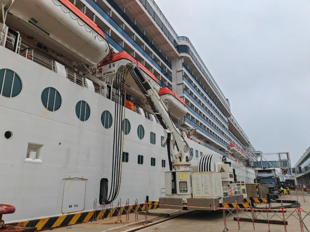 由智光电气股份提供的16MVA高压岸电系统,于2023年由中国船级社质量认证有限公司(CCSC)开展连船前现场检测,完成了岸电空载运行试验、全负荷加载运行试验,取得了岸电系统检测报告和中国船级社检验证书,满足大型邮轮使用岸电的需求。本次岸电连船供电3小时,接电量达到14807kWh,减排二氧化碳3.95吨,实现了青岛邮轮母港首次岸电连船。