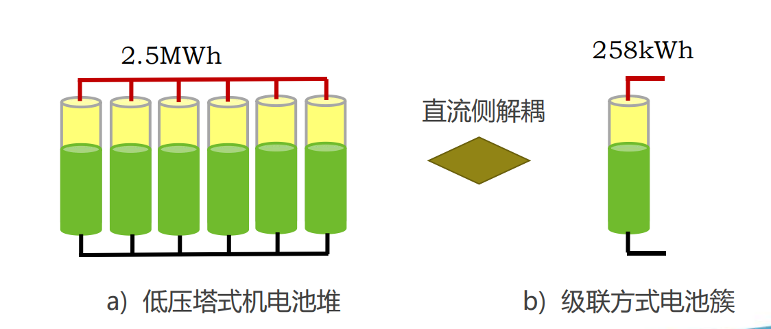 储能系统内各电池簇互不连接,独立控制运行,确保各电池簇运行不高于额定倍率,一簇故障情况下不存在其他电池簇加剧故障簇事故放大情况,提升了储能系统安全性。